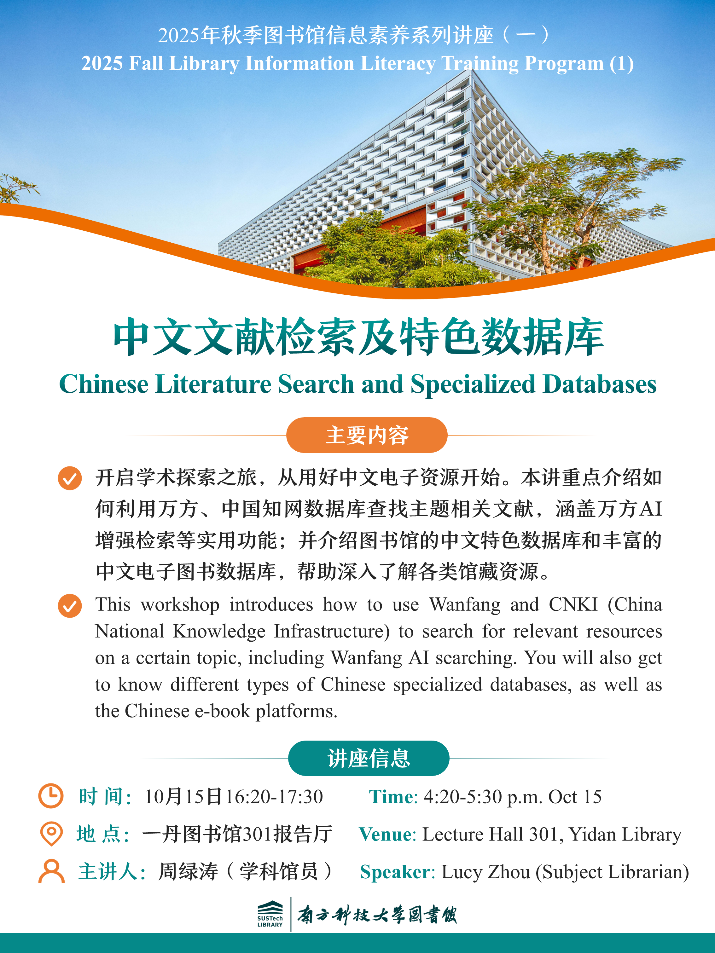 讲座提纲:本讲将介绍中文文献检索,以万方和CNKI数据库检索为例,帮助快速掌握中文数据库的使用;并介绍不同类型的中文特色数据库及电子书数据库。