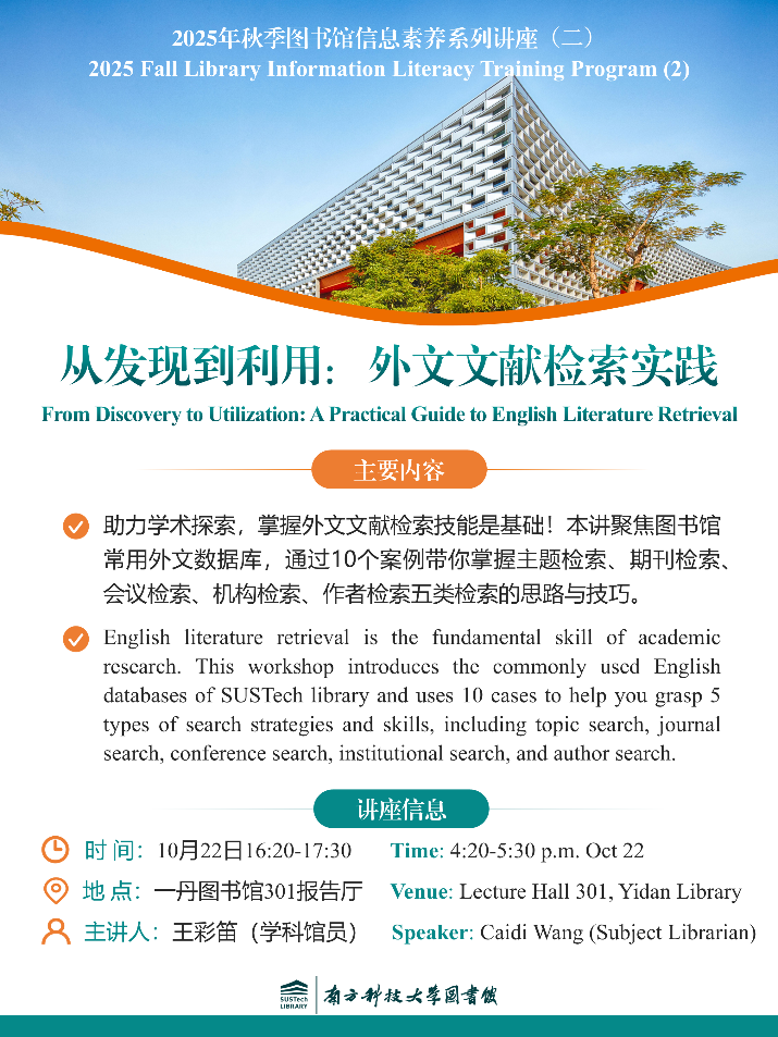图书馆系列讲座往期课件及视频:https://lib.sustech.edu.cn/xljz/list.htm